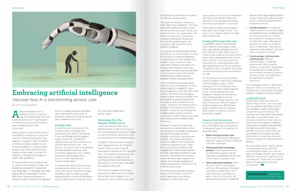 Meighen Health Centre is proud to be featured in the Fall/Winter 2025 issue of Long Term Care Today – The Voice of LTC, a publication by the Ontario Long Term Care Association (OLTCA).